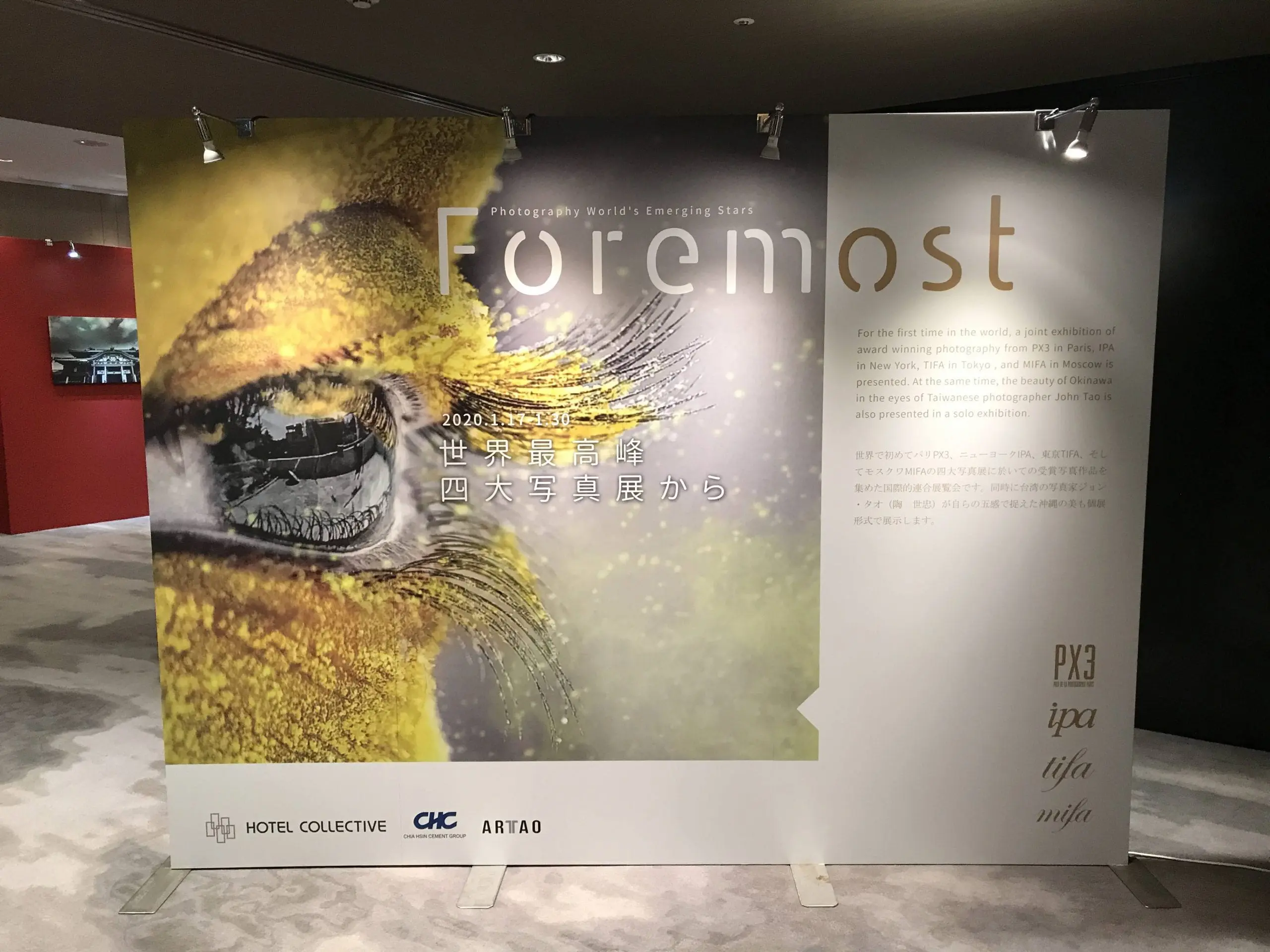 由Hotel Collective主辦,被譽為世界第一、四大國際攝影展,ARTAO藝術行銷協助策劃的「ForeMost世界攝影大賞展」,將展出新銳及大師級攝影師超過300幅的國際優勝作品,並同場加映沖繩主題特展,邀請曾獲巴黎PX3金獎(The Prix dela Photographie Paris)、莫斯科MIFA金獎(Moscow International FotoAwards)、倫敦WPO國家獎、紐約 IPA銀獎(International PhotographyAwards)等獲獎作品和台灣知名攝影家John Tao,親赴沖繩拍攝,捕捉沖繩之美的陶氏五種感官作品將同時作為個展展出,完美串起沖繩與世界的藝術連結。